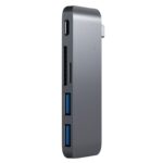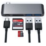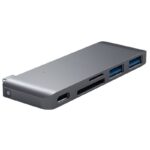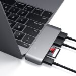 Graças ao hub USB PassechPass-Throughda Satechi, você pode carregar seu MacBook e converter facilmente uma porta USB Tipo-C em duas portas USB 3.0 e um slot para cartão SD e um cartão Micro SD slot. Suporta apenas o MacBook 12″.