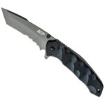 A lâmina possui um design recurvo muito agressivo com serrilhados profundos que atingem o meio da lâmina, conferindo-lhe uma mordida desagradável.