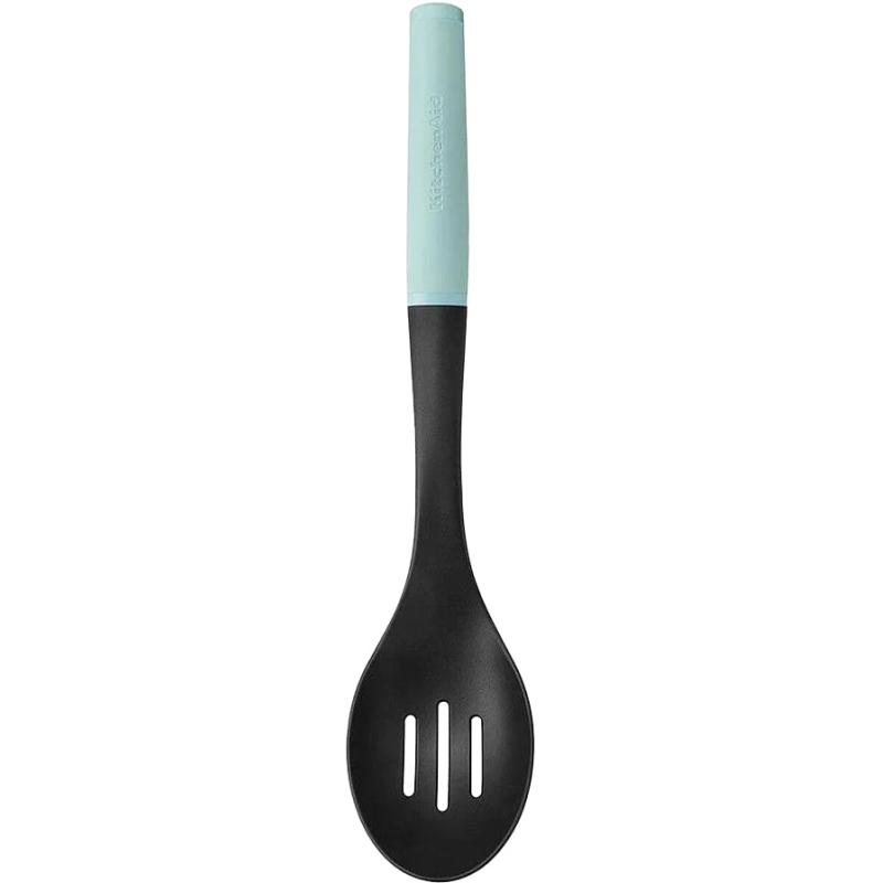 Descubra a colher vazada de nylon KitchenAid: resistente ao calor até 232°C, com 3 ranhuras para escorrer facilmente e design seguro para superfícies antiaderentes.