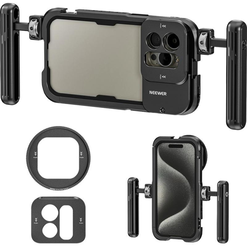 A gaiola de vídeo Neewer PA024 é a ferramenta essencial para criadores de conteúdo que buscam elevar a qualidade de seus vídeos e fotos com seu iPhone 15 Pro Max. Projetado com precisão, ele oferece segurança, versatilidade e compatibilidade com vários acessórios para uma experiência de gravação profissional.