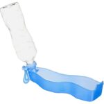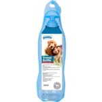 Garrafa de água portátil para cachorro fica na posição vertical e pode ser espremida para dispensar água na bandeja anexada