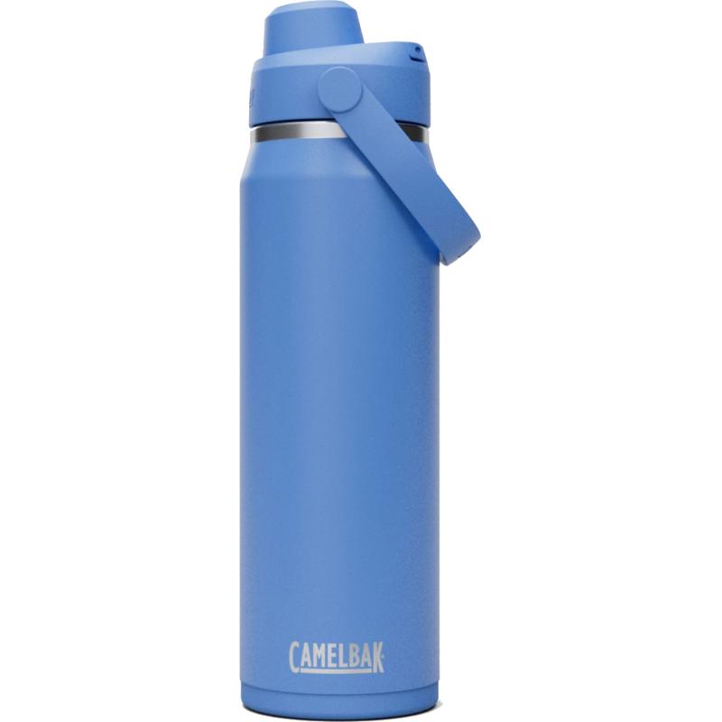 Garrafa Thrive Chug de 25 oz fabricada em aço inoxidável com isolamento a vácuo de parede dupla, ideal para manter as bebidas frias ou quentes por mais tempo. Seu design prático inclui tampa à prova de vazamentos, alça para transporte e é totalmente adequada para lava-louças.