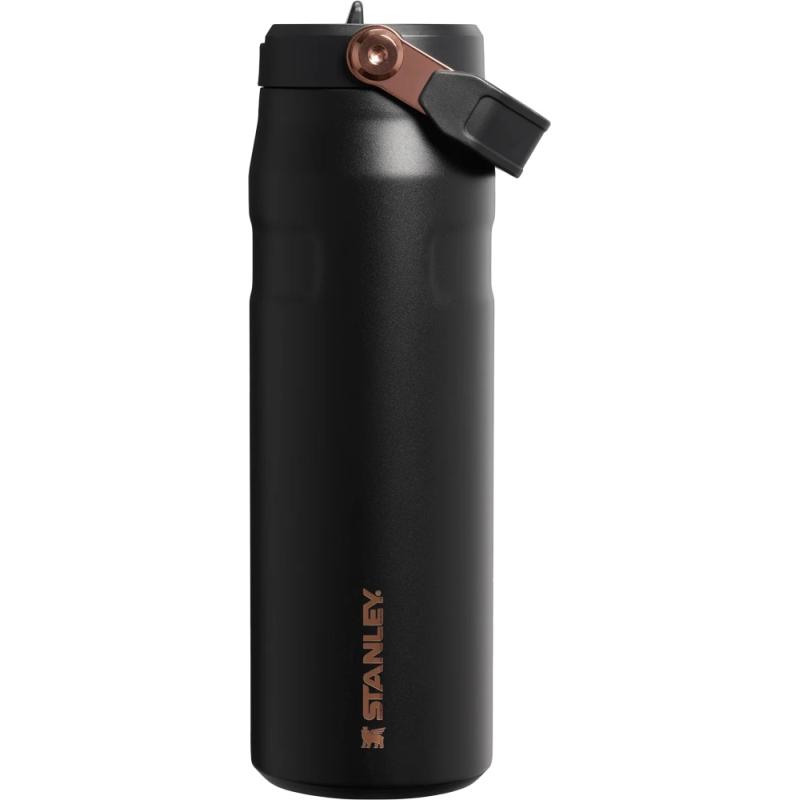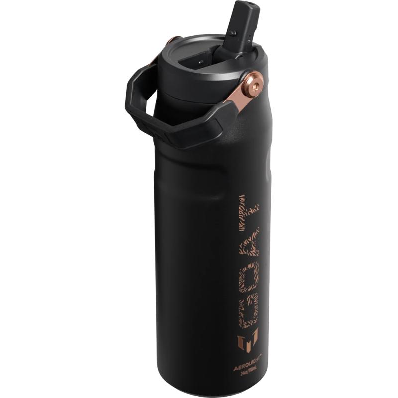 Coleção Messi x Stanley 1913 em Black Pebble com detalhes em ouro-rosa. A garrafa IceFlow de 710 ml é 33% mais leve e permite beber instantaneamente dentro e fora do campo.