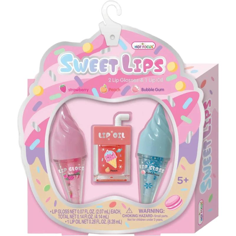 Deixe sua rotina de beleza mais doce com o kit Hot Focus Sweet Lips! O conjunto inclui dois brilhos labiais em formato de sorvete e um gel labial em embalagem divertida, com aromas deliciosos e cores vibrantes. Perfeito para meninas que adoram diversão, cor e cuidar dos lábios com estilo.