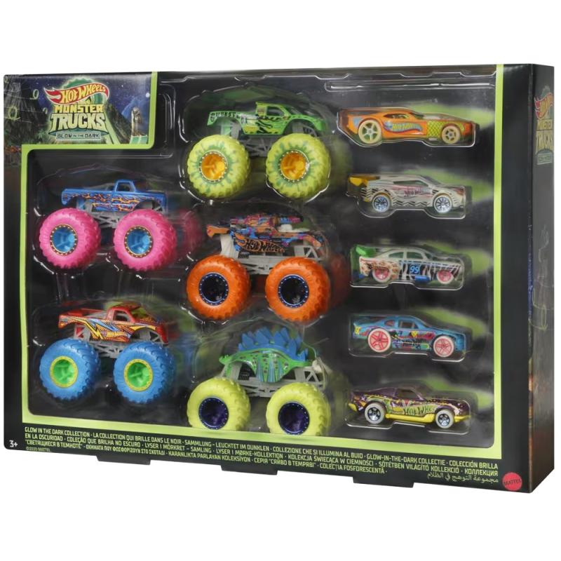 ¡Com 10 veículos juntos, este conjunto de Hot Wheels Monster Trucks Glow in the Dark é uma coleção instantânea! São cinco caminhões monstros fundidos sob pressão e cinco carros fundidos em escala.
