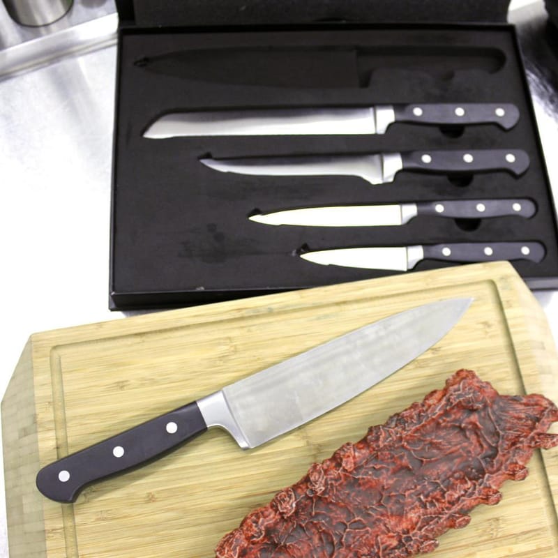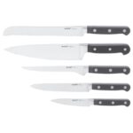 O pacote inclui: faca de pão de 8″, faca de chef de 8″, faca de desossar 6″, faca utilitária de 5″, faca de descascar 3,5″