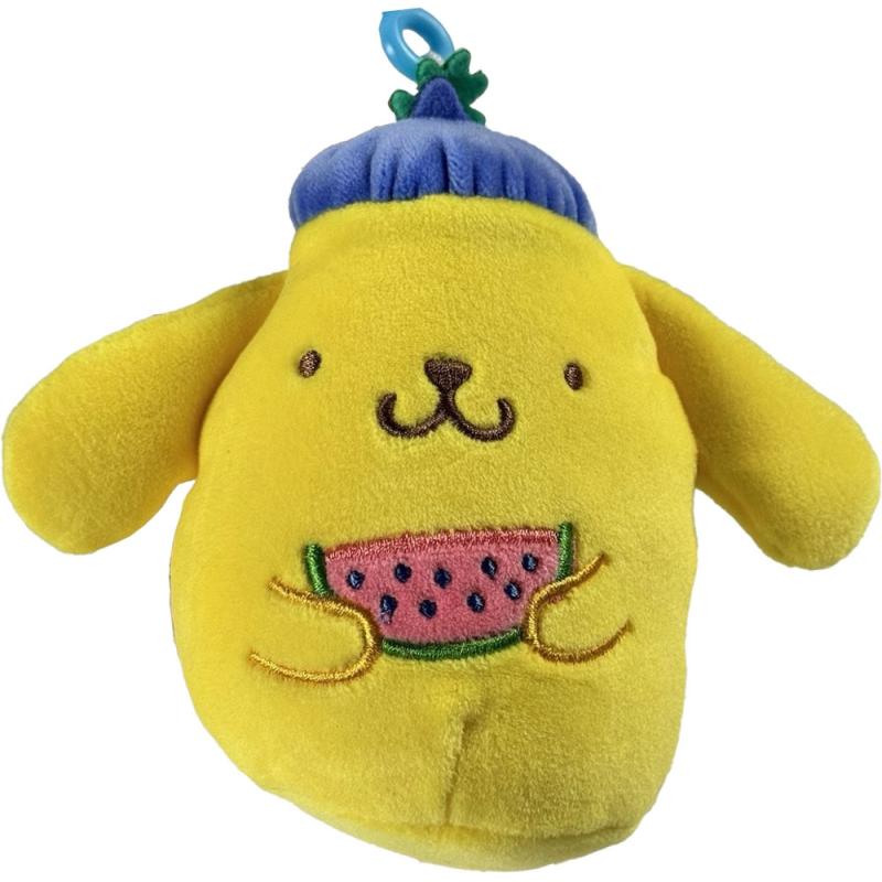 Mini pelúcia fofa do Pompompurin com chapeuzinho azul e segurando uma melancia. Perfeito para pendurar em mochilas, chaveiros ou como item de coleção. Macio, adorável e ideal para fãs da Sanrio!