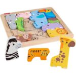 Este quebra-cabeça de madeira inclui 12 blocos com tema de animais que as crianças podem colocar na bandeja ou ficar em pé para brincar de contar histórias. A prática bandeja de armazenamento inclui guias para que as crianças possam organizar os animais em seus respectivos compartimentos de forma independente. As cores e decorações podem variar.