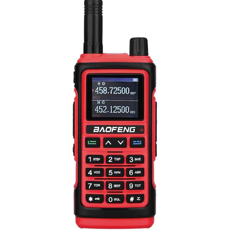 Rádio portátil bidirecional de dupla banda VHF/UHF de alto desempenho, com corpo resistente à água e maior potência de saída, ideal para uso profissional, atividades ao ar livre e comunicações de emergência.