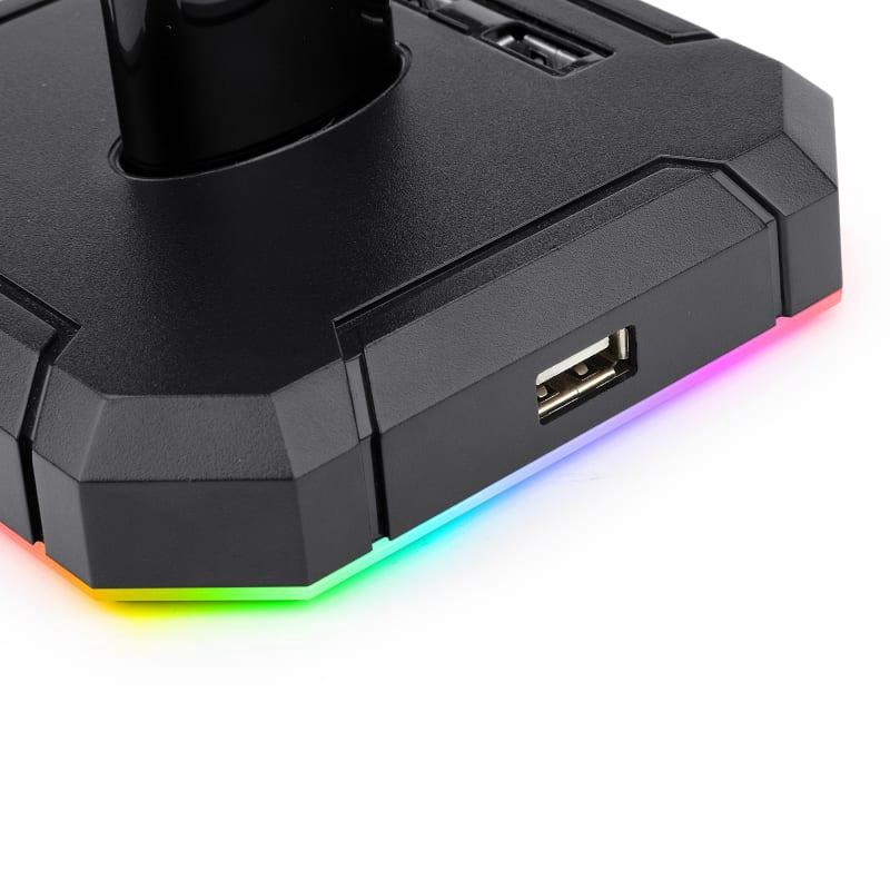 O suporte para fone de ouvido protege o fone de ouvido e libera espaço na mesa com um espaço dedicado para você manter o fone de ouvido. Possui quatro portas USB2.0 com tecnologia ChargeSync, permitindo acessar armazenamento externo ou carregar seus dispositivos móveis. Este suporte para fone de ouvido foi desenvolvido para durar com uma haste de alumínio durável e uma base de borracha antiderrapante para garantir nenhum movimento indesejado. A Redragon equipou o SCEPTER PRO com iluminação RGB dinâmica em toda a base do suporte. Essa iluminação pode ser alterada entre 10 modos pressionando um botão.