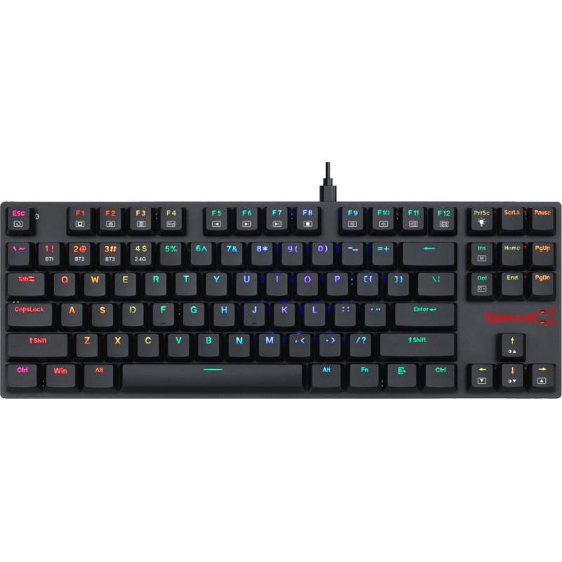 Teclado mecânico para jogos sem fio para vários dispositivos que oferece conexão sem fio 2.4G ultrarrápida, Bluetooth 5.0 ou cabo Tipo C. O teclado pode emparelhar até 3 dispositivos Bluetooth e pode ser usado com fio durante o carregamento, além dos recursos do teclado mecânico para jogos. uma construção em metal sólido/ABS, teclas montadas em placa, teclas projetadas com precisão, interruptores azuis à prova de poeira de última geração
